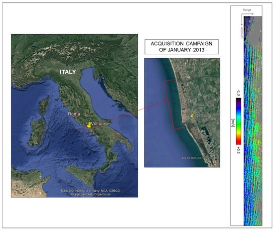 To show the potential of these methodologies in an operational context, we show in Figure 3 some results related to an acquisition performed in January 2013 in an area along the south coast of Italy that includes the Volturno river estuary (see the zoomed-in area of Figure 3). The test area covers about 7 km × 3 km (azimuth and range) along the coastline. Data were collected in January 2013 by an airborne SAR system, the InSAeS4 system (also called TELAR), an Italian-operated, InSAR-oriented airborne platform operating at the X-Band [290,291]. The area encompasses the Volturno river estuary (see the zoomed-in area in Figure 3). The test area covers about 7 km × 3 km (azimuth and range) along the coastline. On the right side of Figure 3 is the estimated sea surface velocity map. The mean value decreases toward the coast, which is expected behavior for a marine environment.