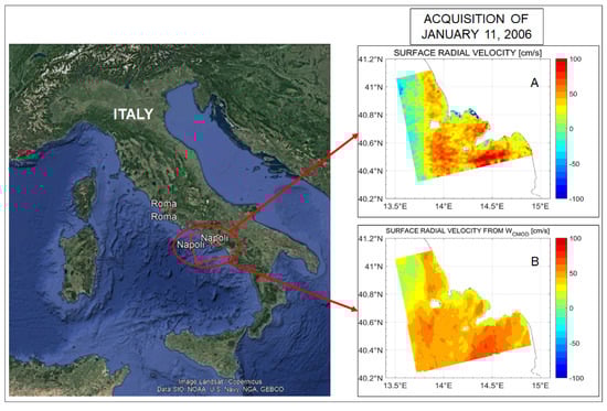 The test site presented in [275], is situated in southern Italy near the Gulf of Naples and is indicated by red on the left panel. On the right, panel (A) presents the surface radial velocity map, and panel (B) displays the surface radial velocity due to the wind, both obtained from the DCA technique [275]. The results are obtained from an ASAR ENVISAT acquisition on 11 January 2006.