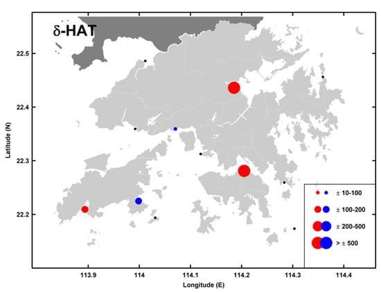 δ-HAT map for the Hong Kong tide gauge network [352]. Size of the markers shows the relative magnitude according to the legend, expressed in units of mm m-1. Red/blue colors indicate positive/negative TACs, and black markers indicate insignificant values.