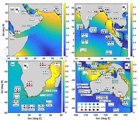 M2 TACs in four different regions of the Indian Ocean: (a) the Arabian Sea, (b) the Bay of Bengal, (c) Africa, and (d) the Australian region. Symbols inside boxes indicate three different frequency bands: squares are the sub-annual (SA) band, circles are the annual (ANN) band, and stars are the interannual (IA) band. Station names are also indicated. Color shading of the symbols indicates positive (shades of red) and negative (shades of blue) TACs, according to the legend at the bottom right. Background colors show tidal amplitudes (corresponding to the color bar at the right of each subplot in units of meters) and phases (solid lines, in increments of 30°) from the TPXO 7.2 global solution [374]. The figure is taken from [372].