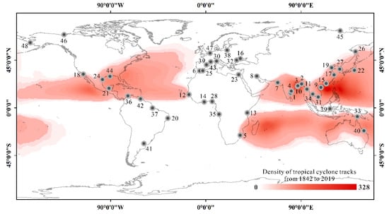 Storm surge is the most severe impact of tropical cyclones in river deltas. The combined consequences of high winds and water levels are responsible for considerable property damage and high causality rates in densely populated delta river regions worldwide [298,375]. In total, 26 of 48 major coastal deltas are located in tropical areas (see Figure 5), making them vulnerable to cyclonic storms. The IBTrACS database (v04r00) (downloaded from the IBTrACS website https://www.ncdc.noaa.gov/ibtracs/index.php?name=ibtracs-data; IBTrACS-All data v04r00 all storms points shapefile (accessed on 1 January 2021)), which contains complete global datasets of historical tropical cyclone tracks from 1842 to 2019, is used to calculate the density of all tropical cyclone tracks, shown in Figure 8. Many previous studies have documented a substantial global increase in severe cyclones and a consistent shift of the latitude of maximum tropical cyclone intensity, which agrees with the projections of future climate models [376]. Many studies have also assessed the potential risk of tropical cyclones in the coming decades and centuries in densely populated river delta cities/regions. Table 1 shows the risk rate index of 48 major coastal cities, and Table 2 summarizes the risk conditions of the world’s most significant river delta regions.