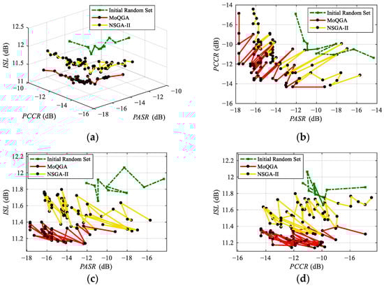 Comparing the results of quaternary code design with binary code design, we can see that when designing a quaternary phase code sequence set, the obtained ISL value of MoQGA is much higher than the binary case. And their trend via different sequence length N is the same. The ISL value increases as N increases. The results indicate that the ISL value results of MoQGA will become worse when the system’s degree of freedom has increased while the maximum generation and number of the individuals in the population remain unchanged. This phenomenon is not obvious but also exists in the results of the PSL value results. Comparing the PSL results under binary and quaternary case, the binary phase code sequence set results of MoQGA are 2.66 dB and 2.26 dB lower than BiST respectively (corresponding to M = 3 and M = 4). However, the quaternary results are only 1.75 dB and 1.73 dB lower than BiST.
