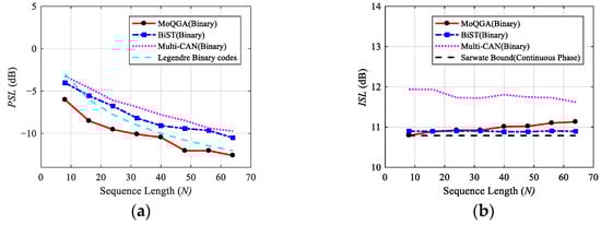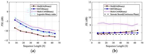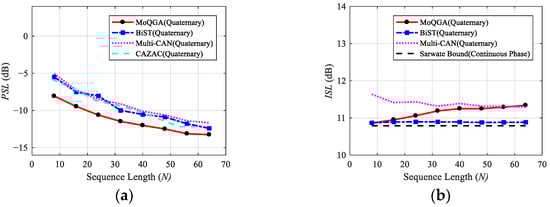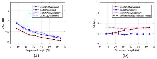 PSL result. The result of MoQGA is 2.09 dB lower than Multi-CAN, 1.73 dB lower than BiST, and 1.65 dB lower than the CAZAC sequence on average.