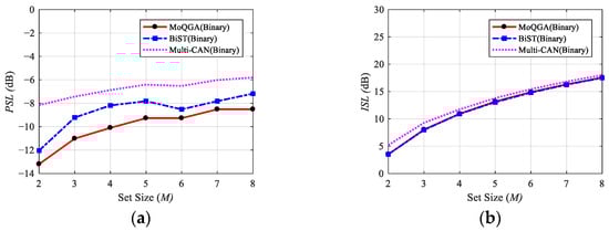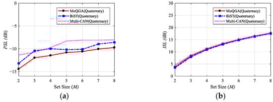 In order to analyze the impact of code sequence set size on the PSL and ISL result, the sequence design parameters are . The maximum generation is still set to 300, and the number of individuals in the population is still set to 100. The following results are still obtained over 10 trials.