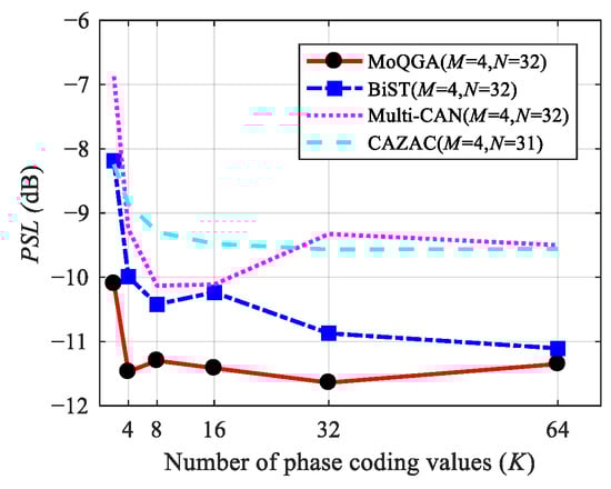 PSL values of phase code sequence set designed by different algorithms. As the number of phase values