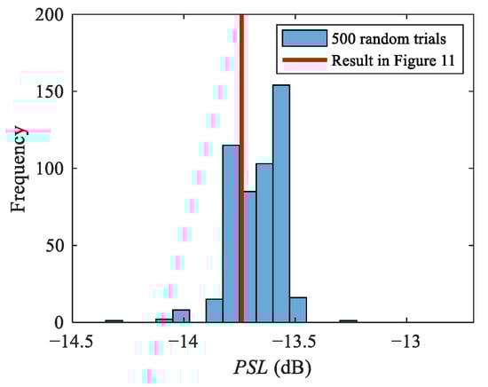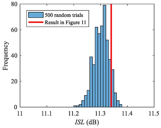 ISL = 11.34 dB. Then, 500 trials with random initial populations are calculated. The results are counted in
