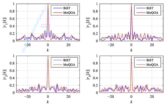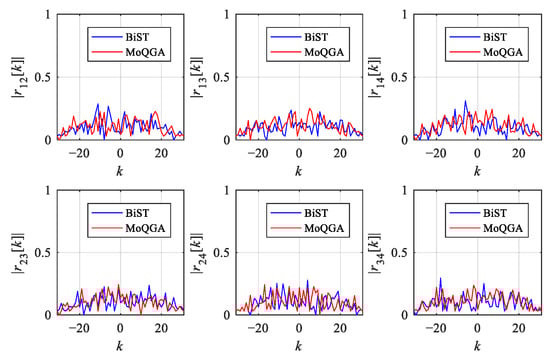 Figure 18 show the aperiodic auto- and cross-correlation functions of the phase code sequence set designed by MoQGA and BiST under