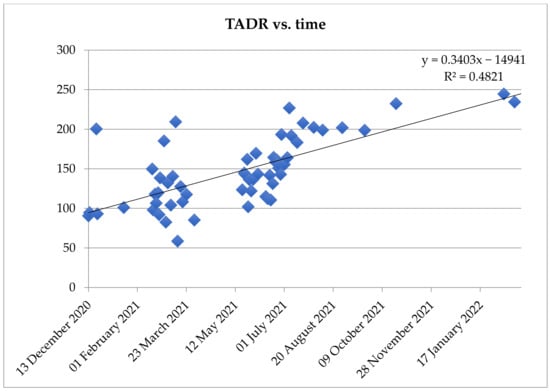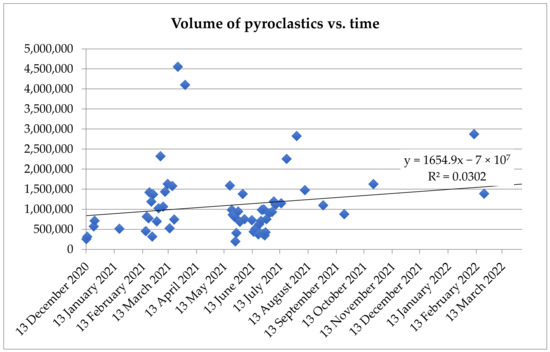 From a volcanological point of view, it is worth noting that if we exclude the two outliers of 23 and 31 March 2021, which emitted more than 4 × 106 m3 of tephra, the volume of pyroclastics which erupted during the LF episodes occurring between mid-December 2020 and February 2022 increased with time. This can clearly be seen from Figure 4, where we report the distribution of the erupted volumes with time and its linear trend. In addition, the time-averaged discharge rate (TADR) and its trend increased with time (Figure 5). These observations, i.e., of the increase of erupted volume of pyroclastics and rate of eruption with time, suggested that the sequence of paroxysmal events was not yet over [31].