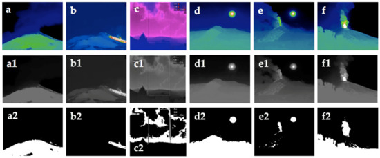 (a) Effect of the Sun reflection on the ground slope (green area), EMOT camera; (b) cooling lava flow (white area), EMOT camera; (c) Effect of the Sun on the clouds (pink area), ENT camera; (d) the Sun in the camera field of view (white circle), EMCT camera; (e) Combined effects: lava fountain in presence of the Sun in the field of view, EMCT camera; (f) lava fountain and Sun reflection on the vegetation in the foreground, EBT camera. (a1–f1) are the corresponding gray images, and (a2–f2) are the corresponding black and white binarized images.