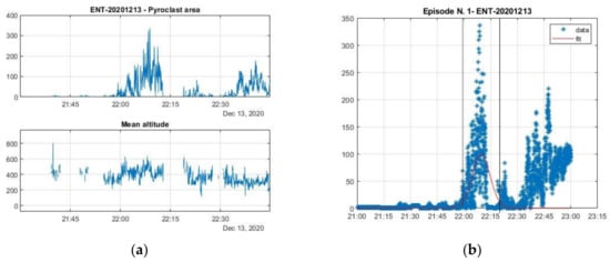 (a) Area (in pixel2) and mean altitude (in pixels, measured above the crater rim) against time of the 13 December 2020 lava fountain episode as retrieved from the ENT camera, and (b) Gaussian interpolation (red line) of the pyroclastic area against time of the 13 December 2020 lava fountain episode retrieved from the ENT camera.