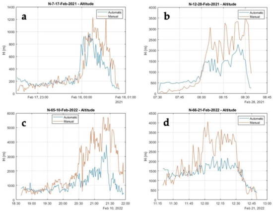 Time series of heights estimated by using the automated and the manual approaches for a few episodes of the data set against time, with the blue line for the automated, and the orange line for the manual detection: (a) Episode 7, 17–18 February 2021; (b) Episode 12, 28 February 2021; (c) Episode 65, 10 February 2022, and (d) Episode 66, 21 February 2022.