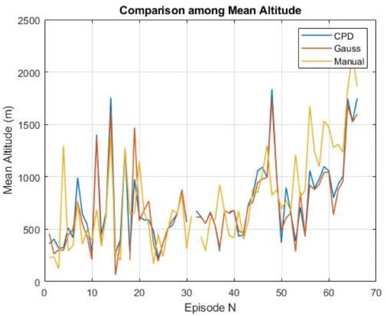 In more detail, Figure 12 shows that for most of the episodes, there is a good agreement between the average mean heights estimated for each episode, not only between those obtained by using the CPD and Gaussian approaches, but also between these and those manually estimated. Altitudes obtained with the manual approach are, on average, 12% lower than those obtained by using the CPD approach, and 7% lower than the Gaussian one.