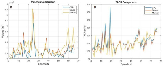 The comparison between estimated volumes and TADR by the three methods are reported in Figure 14a,b. A good agreement between the automated and manual estimation is apparent, bearing in mind that the automated volumes are usually smaller than the manual ones, because the durations refer to the sustained phase of the LF, while the manual and automated TADR are in good agreement because this feature is computed as the ratio between volumes and duration of each LF episode. In more detail, manual estimated volumes are, on average, about 26% higher, with a standard deviation of about 77% than those estimated by using the CPD approach, and 13% lower than the Gaussian, with a standard deviation of about 107%. The TADR manually estimated is about 15% lower that the CPD, with a standard deviation of 77% and 8% lower than the Gaussian, with a standard deviation of 33%.