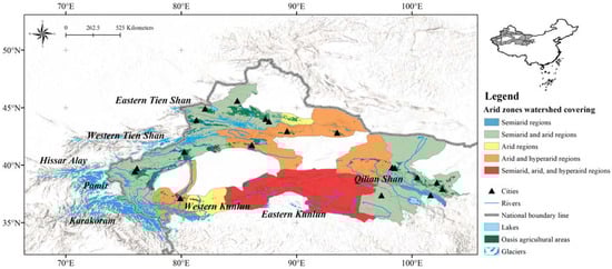 Locations of watersheds and OAAs affected by glaciers in the dryland areas of China. Colors indicate drought in subhumid, semiarid, arid, and hyperarid zones and the tertiary watersheds in the dryland areas of China affected by the QL, EK, WK, ET, WT, KA, PA, and HA. Oasis agricultural areas exist along rivers that originate from glaciers, and cities are built around oases. The base map is taken from World Hillshade provided by Esri (https://services.arcgisonline.com/arcgis/rest/services/Elevation/World_Hillshade/MapServer, accessed on 7 March 2022).