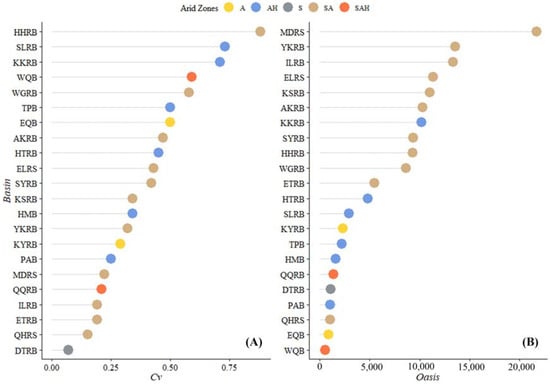 Dot plot of the coefficient of variation of precipitation (A) and area of oasis agricultural areas (B) in the watersheds of different arid zones. Different colors represent different arid zones.