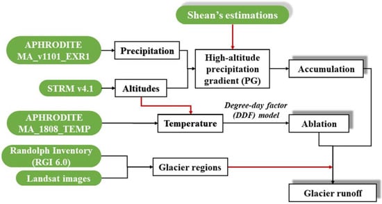 Accurate and detailed glacier mass balance (GMB) data are obtained through continuous field observation, which provide a deeper understanding of glacier–climate and glacier–hydrology interactions and are the basis for glacier-related modeling verification [,]. Due to field observations’ financial and logistical difficulties, it is common to calculate continuous GMB for long time series at a regional scale [,]. However, only 40 glaciers, which are internationally called “climate reference” glaciers, have been consistently monitored long enough to measure changes under climate change, while none of them are located in the DAC, indicating a lack of long-term mass balance observations for this region. At the regional scale, degree-day factor models are widely used to calculate glacier runoff (GR) driven by the atmosphere based on meteorological data recorded by meteorological stations [,]. Nevertheless, the degree-day factor model is limited by the number of meteorological stations available, and the model does not fully restore the two processes of glacier ablation and accumulation.