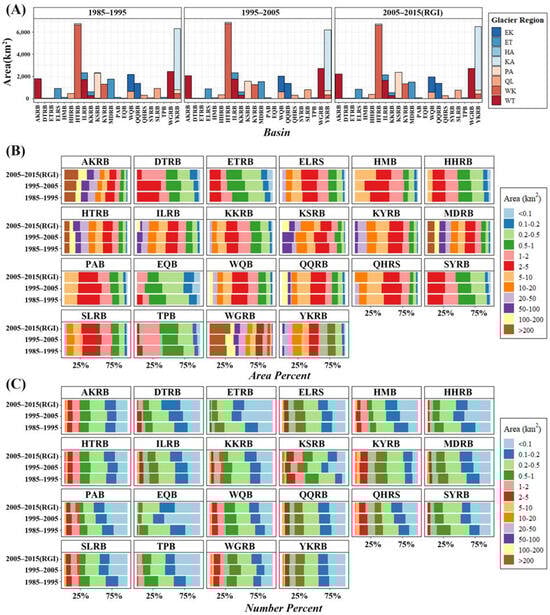 The area of glaciers in different river basins formed by (A) different glacier regions and the (B) area proportion and (C) number proportion of the area of glaciers in each basin in different periods. Glaciers were classified into 12 groups by area.