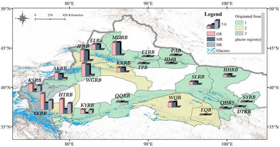 In this study, the Shean Mass Balance dataset was used to reconcile high-altitude precipitation. The yearly mass balance of glaciers influencing the DAC from 1961 to 2015 was calculated from the difference between accumulation obtained from corrected precipitation and ablation calculated by the DDF model. We created a long-time series dataset of the total GR dataset, including DR and MR, based on atmospheric hydrothermal conditions at large regional scales with a spatial resolution of 100 m. It is worth noting that GR in this paper refers to the runoff generated within the geographical area of a glacier or the runoff generated under the glacier area of different time ranges extracted from GEE based on the RGI. GR included DR, which was stored rainfall in the cold seasons and released runoff in the ablation seasons, while MR resulted from glacier mass balance, which is also called excessive MR or the imbalanced part of GR. The GR in each basin from different glacier regions in the DAC is shown in Figure 5. The average GR in the DAC for the period was (100.81 ± 68.71) × 108 m3, where MR accounted for 68%. MR largely controlled basins affected by the DAC’s glaciers.