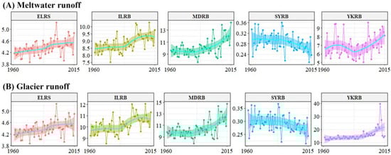 Figure 6 shows the time series of MR and total GR in basins with the top four OAAs and SYRB after Loess smoothing. Locally estimated scatterplot smoothing (LOESS) and locally weighted scatterplot smoothing (LOWESS) are two nonparametric regression methods developed for scatterplot smoothing. When there is only one independent variable and no prior weights, the functions “LOESS” [] and “LOWESS” [] in R language programming are equivalent, in principle. In the past 50 years, except for the DTRB, HHRB, and SYRB, the runoff of the other basins showed a continuously increasing trend, although periods of significant increase differed. The MK test showed that the GR in the ELRS and KKRB increased significantly after 2000, while KSRB and HTRB levels increased significantly after 1980. In the DTRB, GR began to decrease after 1990, while in the HHRB, it began to decline after 1995, but neither decreased significantly before 2015. Only the GR series in the SYRB began to decline after 2000 and significantly reduced after 2010, as the results of the MK test showed, and the trend was consistent with previous studies []. The MK value and time series of DR, MR, and total GR for all basins are illustrated in Supplementary Materials Figures S2–S6.