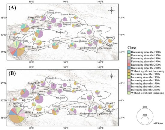 Map of (A) number and (B) area distributions of different types of glaciers in each river basin. Different colors indicate the trends of different glaciers in different river basins of China and the periods in which significant changes began in the past 55 years.
