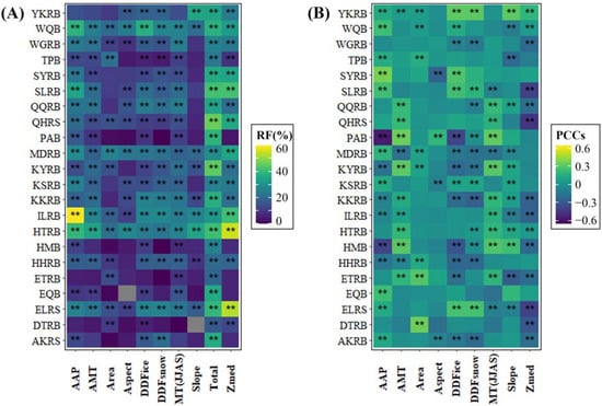 Heatmap of (A) the results of random forest and (B) Spearman correlation coefficients between MR and potential impact factors for each watershed. Significance level: ** p < 0.05.