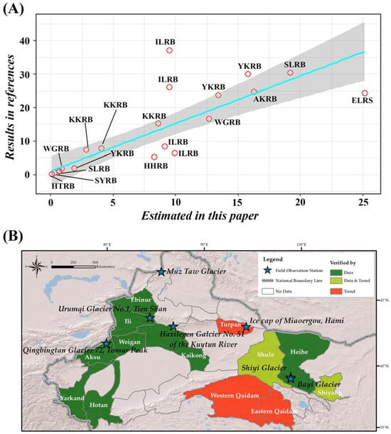 In this paper, scientific references were selected via systematic searches of keywords including the name of each watershed, “glacier runoff”, and “meltwater runoff” using the websites of academic journals (Science Direct, Web of Knowledge, China National Knowledge Infrastructure) to compare the estimated values of the GR obtained in this paper. In total, only 11 of the 22 glacier-derived basins in the DAC [,,,,,,,,,,,] had reference numerical values and GR tendencies [,] for the other three watersheds, as shown in Figure 9. Based on these studies, reference numeric values were classified as the GR recharge percentage (four basins), the GR growth rate (four basins), and GR (five basins). The ratio of our results and reference values for the DAC was 0.67. The MR in the HMB showed a slight decreasing trend consistent with our estimate. Hydrological stations in the WQB and EQB showed a sudden change in runoff in 2004, and our estimates show that the turning points of the MR in the EQB and WQB occurred in 2001 and 2002, respectively [].