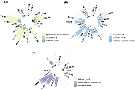 The proportion of GR in agricultural, industrial, and municipal water consumption DAC basins is shown in Figure 10. Agrarian water consumption at the watershed scale was obtained by averaging agricultural water consumption statistical data to land use types of agricultural land and then ranging regional statistics, which were the same as those of industrial and municipal water consumption. Because quantifying the economic and social impacts of cryospheric change is critical to make public policy and impact adaptation decisions, our estimate may support the referentially quantifiable long-term GR time series.