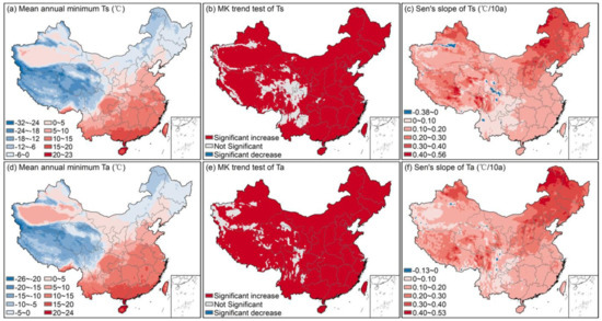 Spatial distribution of annual mean minimum Ts and Ta. (a) Trends of annual mean minimum Ts based on the Mann–Kendall trend test (95% confidence level), (b) Sen’s slope of the annual mean minimum Ts, (c) annual mean minimum Ta, (d) trends of annual mean minimum Ta based on the Mann–Kendall trend test (95% confidence level), (e) Sen’s slope of the annual mean minimum Ta (f) across China during the 1950~2020.