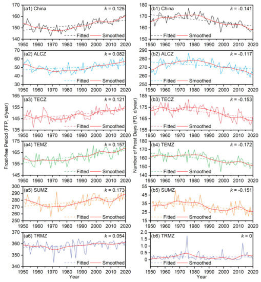 Interannual trends and variations of FFP and FD for China and different climate type zones in China during the 1950~2020. k represents the degree of variation in annual FFP and FD, respectively, i.e., the slope of the data variation. (a1–a6) Annual FFP; (b1–b6) Annual FD.
