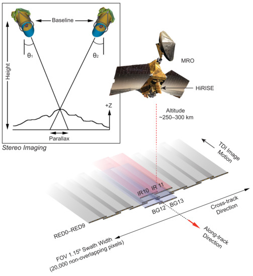 MRO launched 12 August 2005, and has been in operation at Mars since March 2006 [1]. HiRISE [29] is a nadir-pointing camera with a 0.5 m diameter primary mirror that images in pushbroom mode. The focal plane consists of a staggered array of fourteen charge-coupled devices (CCDs). The active area of each CCD detector is 2048 px wide (in the cross-track direction) by 128 px long (in the along-track direction). This allows for time delay integration (TDI) in the along-track direction, of up to 128 stages, thereby increasing the signal-to-noise ratio (SNR) and dynamic range of HiRISE images [30]. The swath width is spanned by ten detectors offset on the focal plane such that each detector overlaps the adjacent ones in the cross-track direction by ∼48 px (Figure 1). Thus, a HiRISE image can be up to 20,048 px across, and of arbitrary length (with a footprint size of ∼6 km wide by up to ∼120 km long), depending on imaging mode, memory allocation, and thermal constraints. Each CCD has two channels (e.g., RED0_1 and RED0_0) that are read out individually. The ten CCDs, named RED0–RED9, collect visible light in the 550–850 nm range. The central ∼20% of the full swath is covered by four CCDs positioned above and below the RED detectors so that they overlap two RED CCDs in the along-track direction, providing three-color imaging. Two of the central CCDs collect light in the visible blue-green range (400–600 nm), while the other two collect non-visible light in the near-infrared range (800–1000 nm). The four “color” CCDs—named BG12, BG13, IR10, and IR11—provide enhanced information about the surface composition [31]. The staggered layout of the CCDs also allows for the measurement of surface features observed at different times in the overlapping portions of the image strips, which is used for the correction of spacecraft jitter in HiRISE images.