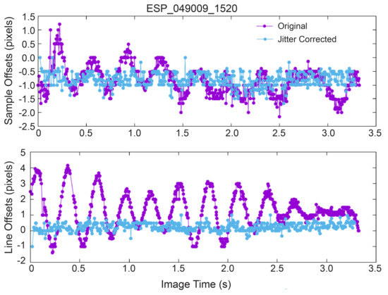 Plots of pixel offsets in the sample, or cross-track (top), and line, or along–track (bottom) directions, measured in the overlapping region of the RED4 and RED5 CCDs over the length of observation ESP_049009_1520. Before jitter correction (purple), pixel offsets show an amplitude of up to 4 px. After correction (light blue), offset amplitudes are reduced to ∼0.5 px in both the sample and line directions.