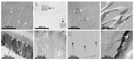 Examples of typical artifacts found in HiRISE DTMs, shown in terrain shaded relief maps, which emphasize the surface texture of the model. In all panels illumination is from upper left, with north oriented to the top of the page. Arrows indicate artifacts. (a) Tiling “boxes” typical of NGATE, and linear artifacts along CCD seams (DTEPC_009689_2645_010084_2645). (b) Isolated noisy boxes possibly due to jitter (DTEEC_057321_1220_057453_1220_A01). (c) Triangular facets in an area of deep shadows in the stereo images (DTEPC_041121_0985_041029_0985_A01). (d) Areas of failed stereo correlation over dark dunes with ripples that were active between the acquisition of the two stereo images (DTEEC_050438_1890_051071_1890_A01). (e) Large triangular facets due to deeply shadowed areas with differing shadow boundaries, as well as an obscured surface in one image due to viewing geometry (DTEEC_069071_2020_063847_2020_A01). (f) Ripple pattern characteristic of jitter in the cross-track direction (DTEEC_039216_1835_039849_1835_A01). (g) Linear features along CCD seam boundaries due to along-track jitter (DTEED_063209_1800_063420_1800_A01). (h) Artifacts typical of those that occur where dark shadow boundaries shifted between stereo image acquisitions (DTEEC_002486_1860_001985_1860_U01).