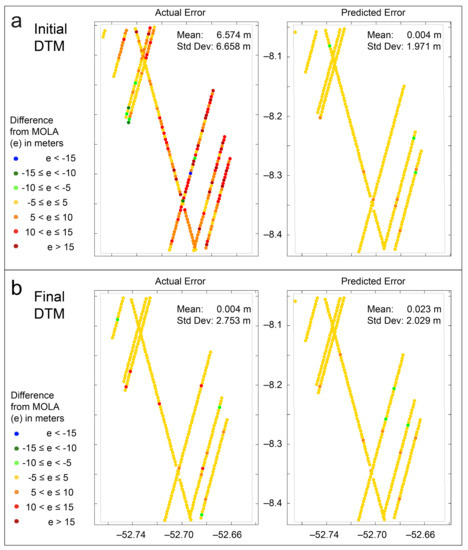 Error maps output from autoTriangulation. Dots represent the difference in elevation in meters between individual MOLA PEDRs and the corresponding location in the HiRISE DTM (not rendered). Dots are color-coded in 5-m increments, with yellow indicating the desired error range of 0 to ±5 m. Horizontal and vertical axes are longitude and latitude, respectively. The left panels (“Actual Error”) show the measured differences in elevation between MOLA and the HiRISE model. The right panels (“Predicted Error”) show the elevation differences after translation and rotation of the HiRISE model within autoTriangulation to achieve a minimum RMS error: (a) Actual error after the initial (relative +Z-control) solution from SOCET Set, and the corresponding predicted error from autoTriangulation. (b) Error maps after applying the transformation from autoTriangulation to the control points in SOCET Set and generating a new DTM. The actual error and the predicted error now agree closely, and the actual error is within the expected range. At this point, the solution is considered acceptable and the MST step is completed. Error maps shown for DTEEC_005161_1720_016237_1720_A01.
