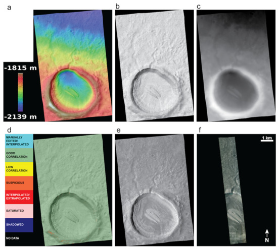 Every post in the gridded DTM is assigned a Figure of Merit (FOM) value encoding the correlation quality, whether a post has been manually edited, or whether it has been automatically interpolated or otherwise failed. SOCET Set FOM values range from 1–99 and are mapped into eight classes (Table A2). The classification scheme is based on a balance between what information could be the most useful to the user, and how the quality information is encoded in SOCET Set. HiRISE FOM maps are generated at the full scale of the corresponding DTM and display classified FOM values draped over a shaded relief image. The FOM maps are created in the JPEG2000 format at full scale and are released as PDS “Extras”, which are ancillary files intended to assist in browsing or visualizing the standard data products [51]. The full-scale product allows the end user to determine the suitability of any area of the DTM for analysis by being able to overlay the FOM with the images and the DTM. Areas designated Manually Edited/Interpolated should be evaluated compared to the images and the DTM to determine if the edits accurately reflect the topography. Low Correlation and Suspicious areas are typically due to low contrast, bland, or noisy areas in the images. They should also be evaluated before performing any analysis to judge how well the stereo correlator captured the topography. Deep shadows in the stereo images result in no reliable elevation data and are designated as Shadowed in the FOM map. Such areas are rare in HiRISE DTMs, but an example of one DTM with a large, shadowed area is shown in Figure 6. Data gaps in one or both of the stereo images are indicated as No Data. Areas of Good Correlation are reliable and accurately reflect the topography, within the error limits of the DTM.