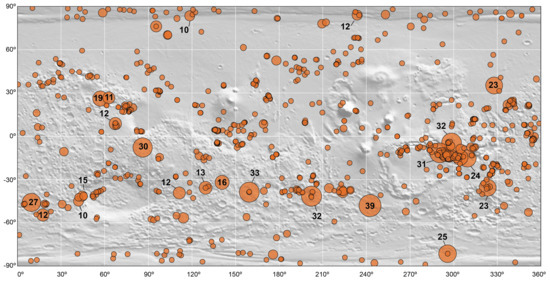 Global map of HiRISE DTM locations available in the PDS (and at https://uahirise.org/dtm, accessed on 10 March 2022) as of December 2021. The symbol size corresponds to the number of unique observations orthorectified to each DTM, not the footprint of the DTMs, which are too small to be distinct at this scale. The smallest circles represent a DTM (or a typical stereo pair; i.e., two orthoimages). Larger circles represent monitoring sites, with labels indicating the number of orthoimages for sites with the most images. The base map is the global MOLA shaded relief topography, in equirectangular projection, positive east longitude 0–360.