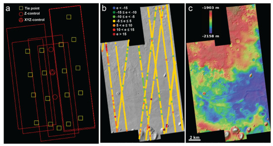 HiRISE DTM mosaic made from three adjacent, overlapping HiRISE stereo pairs (ESP_037162_1880 and ESP_036384_1880, ESP_036740_1880 and ESP_037030_1880, ESP_035962_1880 and ESP_036529_1880). (a) Image footprints overlaid with symbols indicating locations of tie and control points used in SOCET Set MST. (b) Shaded relief image with autoTriangulation error map showing comparison to MOLA. Error “e” is elevation difference from MOLA in meters. The mean elevation difference is −0.71 m, with a standard deviation 4.34 m. (c) Colorized shaded relief image illustrating the continuity of elevation values across seams. Tie points in overlapping regions allowed images to be controlled relatively to within the vertical precision of each DTM, resulting in differences at DTM seams of <1 m.