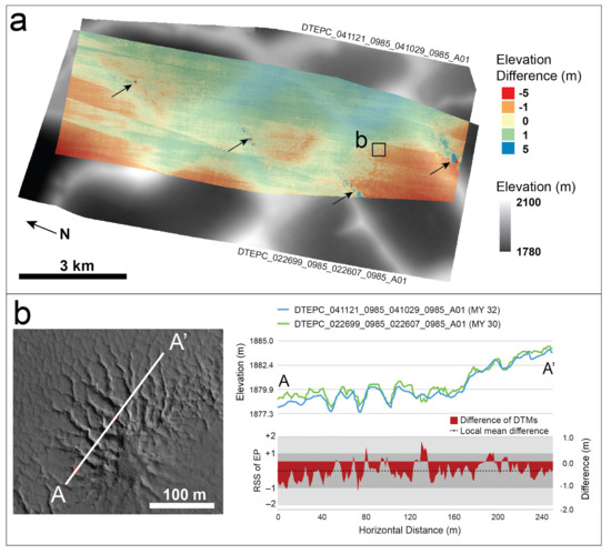 The goal of generating multiple DTMs over a given target is to measure topographic changes (i.e., volumetric changes). The procedures for controlling multiple stereo pairs to create multi-temporal DTMs of the same target is essentially the same as that for tying in additional images for orthorectification. It can be preferable to control stereo pairs for multi-temporal DTM generation simultaneously [52], using stereo pairs acquired at similar seasons for similar illumination. This allows all the images to adjust together to achieve the optimal solution. However, in many cases, the DTM already exists, and new stereo images are tied to the existing model, holding the original stereo pair fixed. The new stereo pair is treated as any other set of additional images in all steps, except jitter correction may be applied for the sake of improving terrain quality. In the situation where a DTM already exists, the MST setup is performed by holding the original stereo pair fixed and allowing both images in the new stereo pair to adjust relative to the original pair. The locations of existing tie points and control points are measured on the new images. Thus, in the case where one or more new stereo pairs are being tied to an existing model, the original HiRISE DTM is used as the elevation reference rather than MOLA data, with elevation reference points used in non-changing areas.