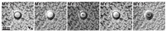 - Malin, M.; Edgett, K.; Posiolova, L.; Mccolley, S.; Noe Dobrea, E. Present-day impact cratering rate and contemporary gully activity on Mars. Science 2006, 314, 1573–1577. [Google Scholar] [CrossRef]