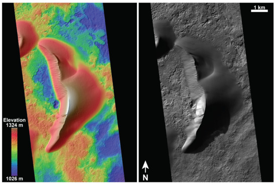 Qualitative methods are also useful for assessing the quality of HiRISE DTMs. The accuracy of a DTM can be assessed by rendering it as a shaded relief image. The shaded relief image does not convey elevation information, but rather illustrates the surface texture of the DTM, and the qualitative shape of the topography. For example, shadows in one of the stereo images can be compared to those in a shaded relief image generated from a DTM (given that the chosen software simulates shadows in a realistic manner) using the illumination angles (sun elevation and azimuth) that precisely match those of the corresponding HiRISE image (Figure 10). Low elevation illumination angles in a shaded relief image emphasize the surface texture and any artifacts due to poor stereo correlation, manual editing, or jitter. Rendering the contours of the DTM over orthoimages, which can be performed in a variety of GIS platforms, is another technique for validating that the surface features are accurately rendered in the topography (e.g., [56]). Care should be taken to use appropriate contour intervals depending on the DTM GSD and local topography.