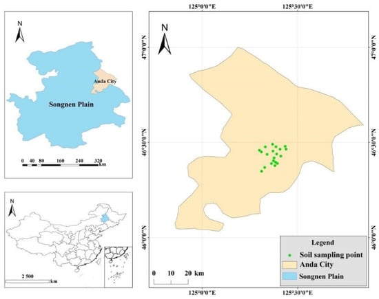 The study target area of this paper is Songnen Plain, which is located in the middle of Song Liao Basin in the northeast of China (Figure 1). This region features a temperate monsoon climate, with an annual precipitation of 500–600 mm. Songnen Plain is an important grain production area of China, producing soybean, wheat, and corn. At the same time, Songnen Plain is one of the three famous big black soil regions in the world [49]. With abundant soil organic matter, rather high active accumulated temperature, and fine hydrothermal conditions, soil moisture and soil organic matter naturally play vital roles in maintaining crop yields. Therefore, it is of great value to study the combined effects of the interaction between soil water and organic matter on the spectral reflectance and accurately estimate the soil moisture content.
