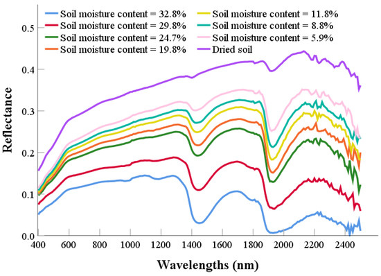 To analyze the interference of soil moisture on soil spectra, artificial gradient moisture content soil samples were selected for spectral measurement. Their moisture content range was from 0.47% to 32.8%; these samples represented the water situations from extreme drought to saturation. In addition, the effect of the soil moisture on the spectrum was presented (Figure 2). The results showed that soil reflectance basically declines with the increase in soil moisture content in the VIS-NIR band (400–2500 nm). The soil moisture spectra had two absorption peaks at around 1400 nm and 1900 nm [58,59,60]. With the increase in the soil moisture, the intensity of absorption particularly increased in these two bands [61]. R.A. Viscarra Rossel mentioned that this phenomenon is caused by fundamental absorption by OH− groups in water molecules [44]. With the increase in the soil moisture content, the number of OH− groups increased and, thereby, the absorption quantity increased. In the end, the absorption peaks became deepened, as shown in Figure 3.