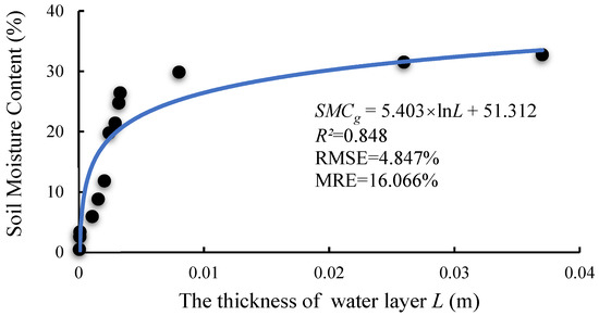 where L is the thickness of water layer and SMCg is the soil moisture content. In this experiment, 51.312 and 5.403 were the specific parameters determined by soil properties. Then, we used the correlation coefficient R², RMSE, and MRE to evaluate the accuracy of the model. In addition, the R², RMSE, and MRE were 0.848, 4.847%, and 16.066%, respectively. The scatter plot and the fitting curve are shown in the Figure 4.