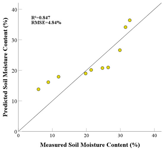 To verify the accuracy, the R² and RMSE between the predicted SMCg and measured SMCg are shown in Figure 5. The R² and RMSE of this method were 0.847 and 4.847%, respectively. This method proved to be effective in predicting the gradient soil moisture content without the interference of other soil properties.