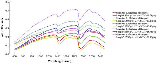 Five selected soil samples and their simulated reflectance values with the same soil moisture were presented in the Figure 6. The Rmodn represented the simulated reflectance of the nth sample and Rn represented the measured reflectance of the nth. The difference between the measured and simulated reflectance was significant. Compared with the simulated reflectance, the measured reflectance was notably smaller than the simulated results in the full bands. In addition, the simulated absorption peaks at 1400 nm and 1900 nm were notably shallower than the measured ones. Apart from the simulated error, the difference mainly came from the difference in soil properties. The biggest difference between the two soil properties was whether they contained organic matter, and the main question was whether this affected their place on the soil reflection spectrum. The answer to this was yes. The soil organic matter made the soil reflectance dark. This result is consistent with the previous study. Moslem Ladoni mentioned that the higher the content of organic matter that exists in the soil, the darker the soil appears. In addition, the soil organic matter decreases overall reflectance and thereby improves the difficulty of measuring other soil properties [64].