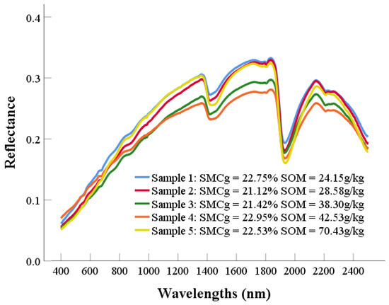 Meanwhile, another five soil samples with similar soil moisture and various soil organic matters were selected, and the reflectance was plotted in Figure 7. Soil samples with different organic matter contents showed absorption characteristics in divergent bands. Figure 7 shows that the effect of SOM was smaller at wavelengths lower that 900 nm, compared with wavelengths higher than 900 nm. In addition, this effect caused by SOM varied band-by-bands. However, this effect was not noted at around 1900 nm. The results also show that 1930 nm was a spectral feature of soil organic matter; the soil reflectance tended to decrease with the increase in soil organic content. The main reason for this is that it corresponds to the effects of the C=O functional group in carboxylic acid [44]. Figure 7 also indicates that the SOM affected the soil reflectance and led to the decreasing trend found in the soil spectrum, in which the soil moisture gradient was disturbed.