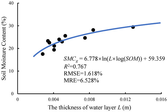 where L was the thickness of water layer, SMCg was the soil moisture content, and SOM was the content of the soil organic matter. In addition, 6.778 and 59.359 were the specific parameters fitted by the different soil properties. The determination coefficient was 0.767. The RMSE and MRE were 1.62% and 6.53%, respectively (Figure 8). The modification of the absorption coefficient, the thicker water layer, and the new curve refitting processes were added to the traditional approach. Thus, SMCg under various soil organic contents can be predicted.