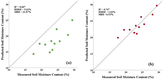 Owing to the disturbance of organic matter, the predicted value of soil moisture content is, thus, not as accurate as before. To conclude, both SOM and SMCg have a negative effect on soil reflectance; the higher contents of soil moisture and soil organic matter are both related to the lower reflectance, showing a synergistic effect. Their cooperation possibly leads to a higher predicted soil moisture content. Therefore, a generalized measurement of soil moisture considering the influence of soil organic matter can result in an inferior measurement accuracy.