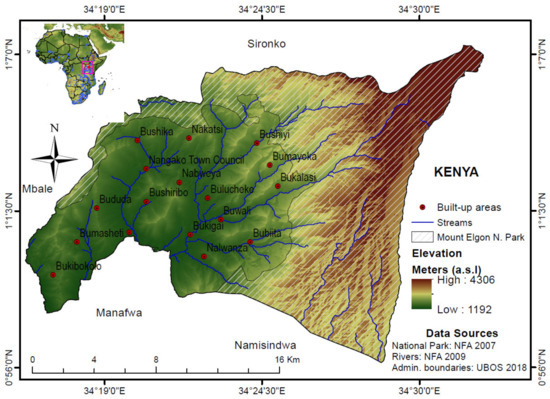 The strongly weathered granites of the Basement Complex dominate the geology of the area with a magmatic carbonatite intrusion, biotite granites, and agglomerate lava [51]. Soils are mainly andosols, nitisols, laterite, and vertisols, with a high clay content [40,52]. The soils are relatively young and fertile, being high in calcium, sodium, and potassium [49,53]. The area experiences a bi-modal rainfall pattern of between 1500 mm and 2000 mm per annum and the mean average temperature ranges between 15 °C and 23 °C [45]. These are favorable conditions that attract settlement and intensive farming on the slopes of Mount Elgon (Figure 2). The vegetation on Mount Elgon and the surrounding environment is zoned altitudinally with montane forest types, Afro-Alpine and moorland cover (above 3500 m), heath zone (35,000–3000 m), low canopy and mixed bamboo (3000 m to 2500 m), tropical montane forest (2500 m–1800 m), and the farmlands at the foot slopes [32,45].