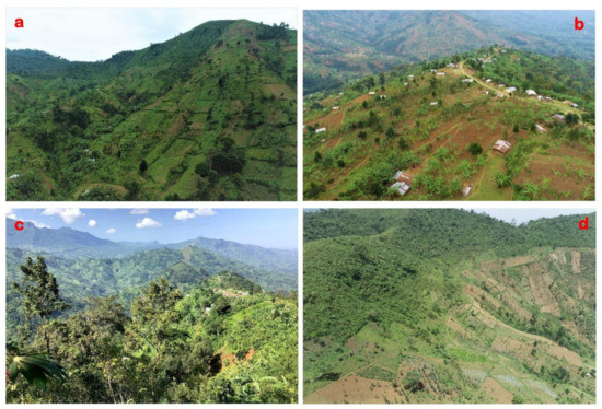 The major perennial crops grown are arabica coffee (cash crop) and bananas (staple foodstuff). During the rainy season, annual crops (maize, beans, tomatoes, yams, cabbages and onions) are cultivated either as standalone or intercropped with bananas and coffee (Figure 2c,d). The settlements are located on relatively gentle slopes and on ridge tops, as seen in Figure 2b. The study area is among the highly populated areas in Sub Saharan Africa and has a very high annual population growth (3.6%) that exceeds the national average of 3% [18,43]. These demographic characteristics combined with the fact that 40% of the total land area was established as a national park leaves the population with inadequate space for settlement and agriculture [32,54].