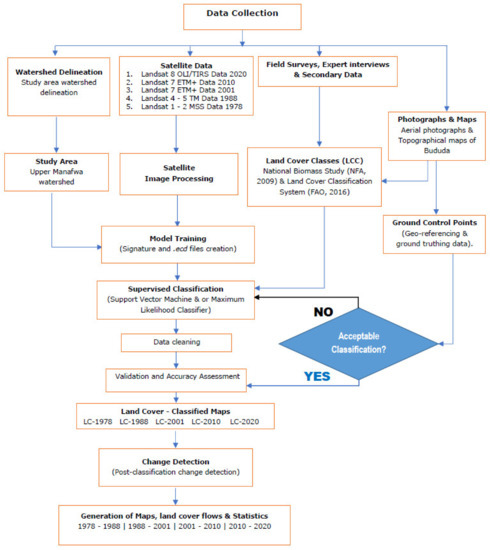 A combination of multitemporal Landsat satellite images was used in this study. Figure 3 illustrates the steps followed to achieve study objectives. Five Landsat images, each representing a decade from 1978 to 2020, were acquired from the United States Geological Survey (USGS) Earth explorer website (https://earthexplorer.usgs.gov/ (accessed on 15 December 2020)). Path and Raw of 170/059 and a cloud cover of less than 30% were used in the search criteria. For comparability purposes, images within the dry season (January to March) were acquired, when cloud cover is minimal and the distinction between subsistence agriculture and natural vegetation is much clearer.